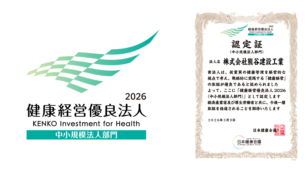 株式会社熊谷建設工業は、2026年3月9日に経済産業省と日本健康会議が共同で選出する「健康経営優良法人2026(中小規模法人部門)」に認定されました。2023年度の同認定以来、4年連続となります。